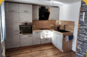 Bild 2: Küche mit Kaffeemaschine, Wasserkocher, Backofen, Mikrowelle und Spülmaschine.